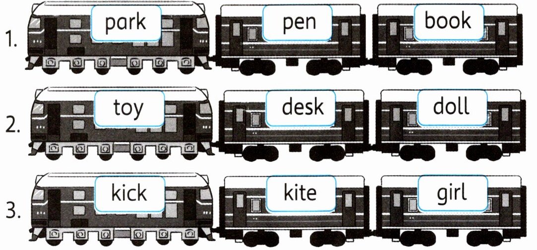 Ⅰ. Listen and circle. 同学们坐上火车,开启了研学之旅。哪节车厢的单词首字母的发音与其他车厢的不同呢?听一听,圈出不同的一项。