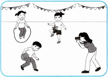 Lingling is playing jianzi. Wang Lan is jumping rope. Daming is playing basketball. Look, Miss Li is taking photos for them!