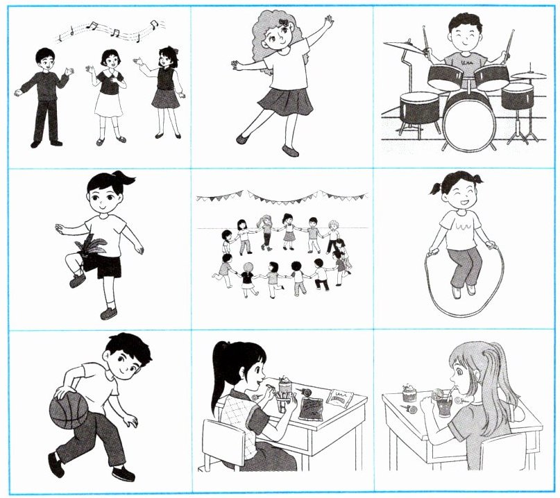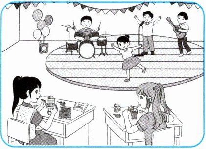 Look, Xiaoqiang is singing. Huahua is dancing. Xiaoli is eating. Maisy is drinking orange juice.