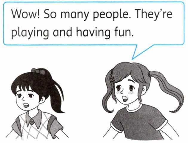 Xiaoli 和 Maisy 来到运动广场。大家都在干什么呢?看一看,写一写。