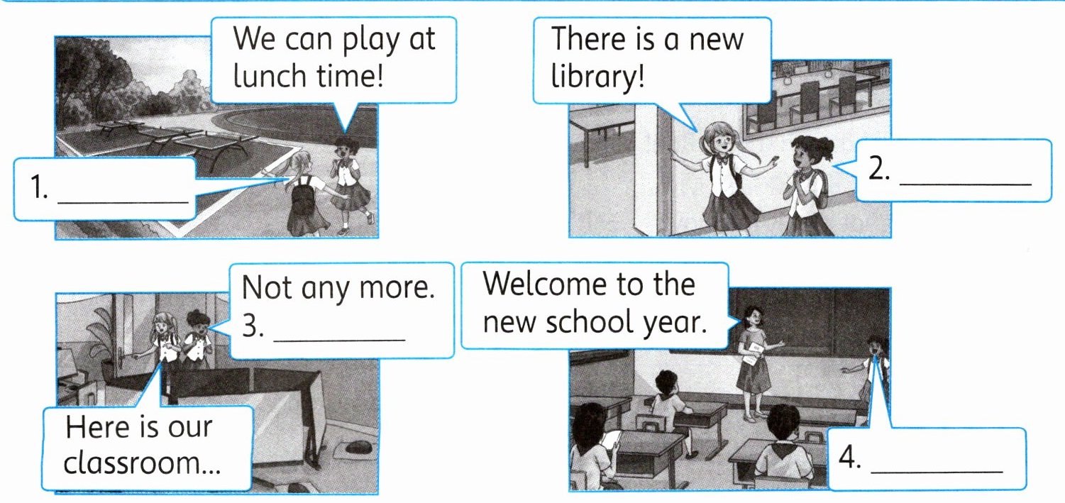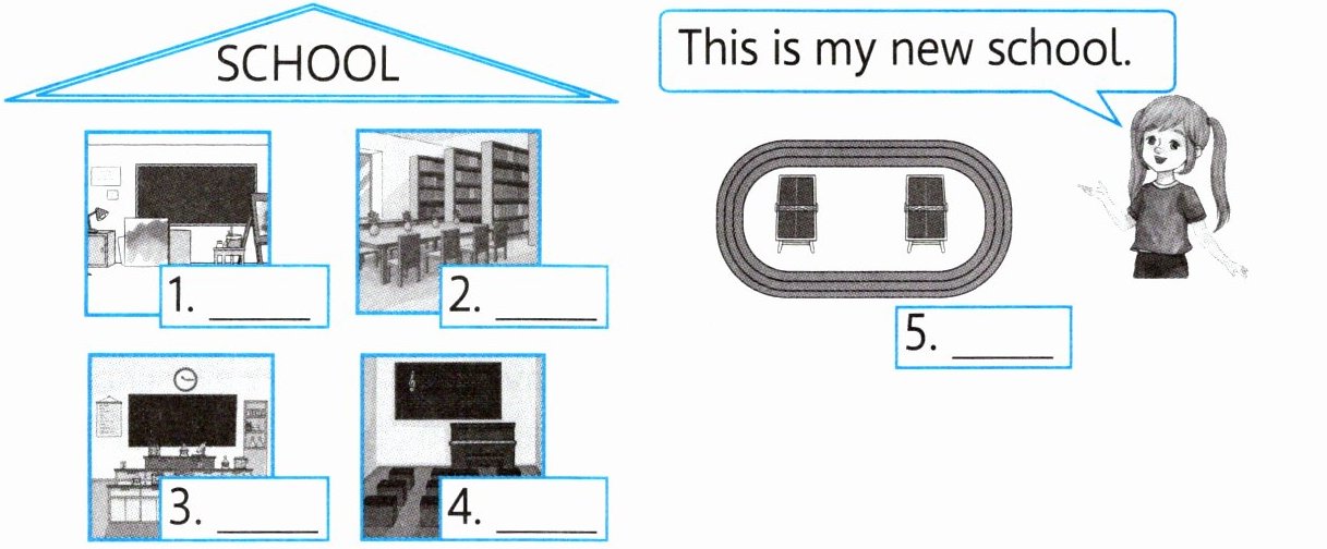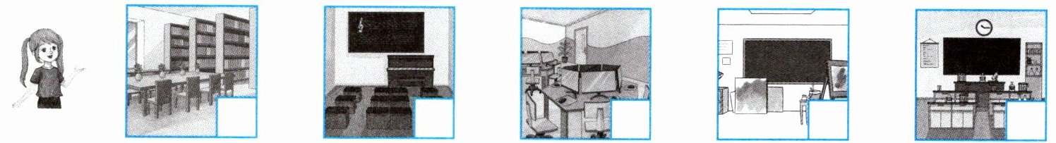 新学期到了,Maisy 正在向 Amy 介绍学校新增的场所。听一听,用数字给下列图片排序。