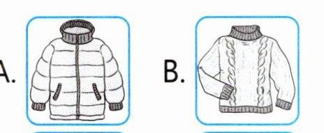 Maisy 一家在为寒假旅行做准备。听一听,选出他们想要带的衣物,将字母序号写在括号内。