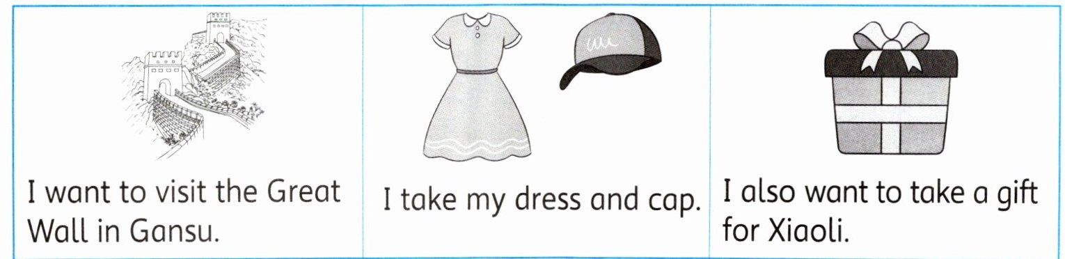 |I want to visit the Great Wall in Gansu.|I take my dress and cap.|I also want to take a gift for Xiaoli.|