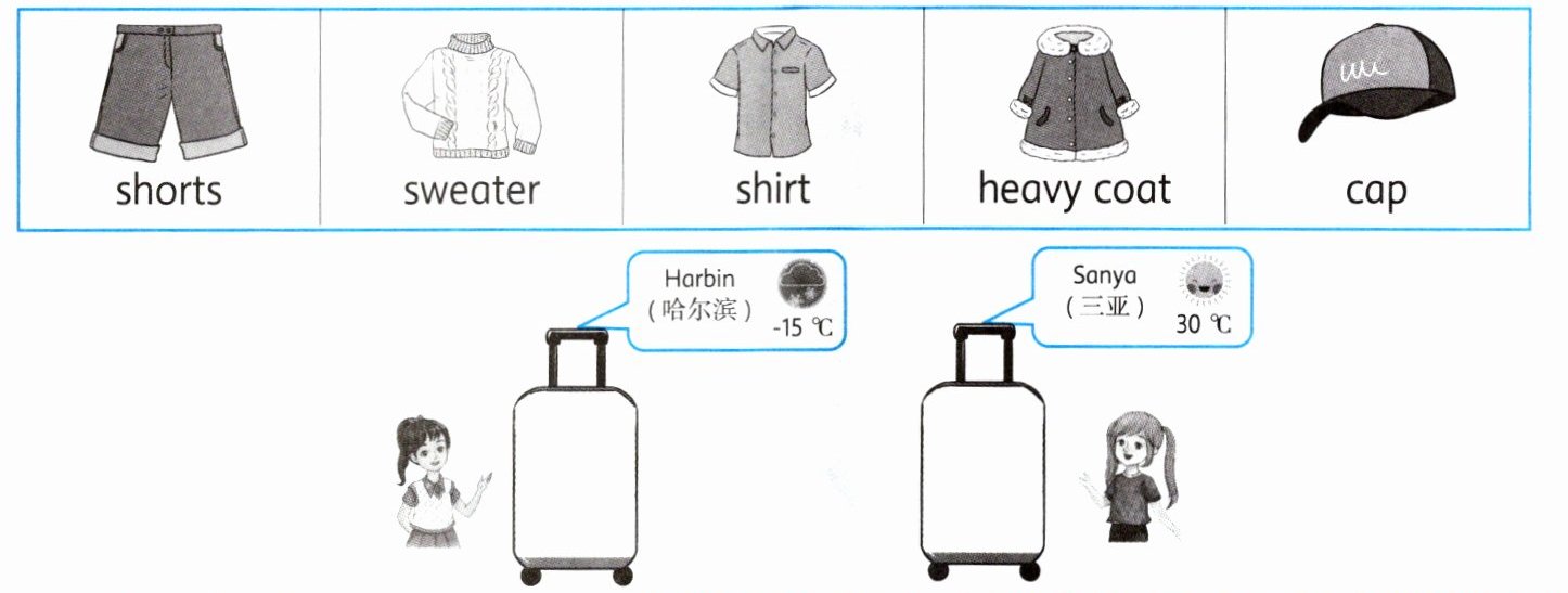 Maisy 和 Xiaoli 正在整理各自出行要携带的衣物。请你帮她们把需要携带的衣物写在相应的行李箱上。