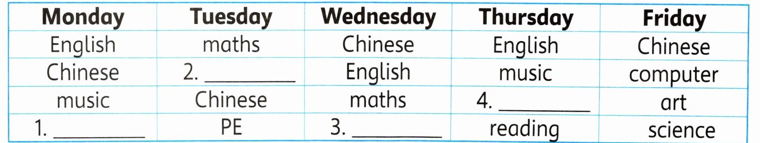 Linlin 正在向 Maisy 介绍新学期的课程。读一读,请你帮 Maisy 把课程表补充完整。