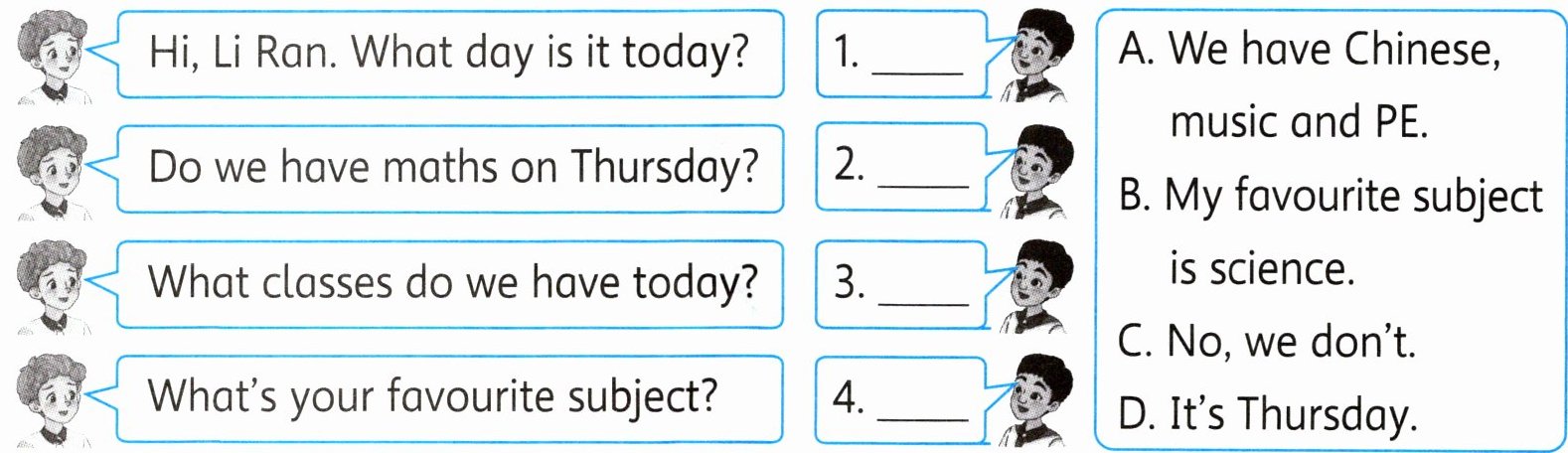 1. PE 2. science 3. music 4. Chinese