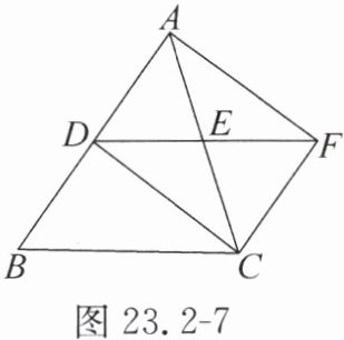 4. 如图 23.2 - 7 所示,在 $ \triangle ABC $ 中,$ AC = BC $,点 $ D $,$ E $ 分别是边 $ AB $,$ AC $ 的中点,将 $ \triangle ADE $ 绕点 $ E $ 旋转 $ 180° $ 得 $ \triangle CFE $,则四边形 $ ADCF $ 一定是( ).