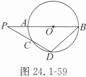 2. 如图 24.1 - 59,$PAB$,$PCD为\odot O$的两条割线,$PAB过圆心O$,若$\overset{\frown}{AC}= \overset{\frown}{CD}$,$\angle P = 30^{\circ}$,求$\angle BDC$的度数.