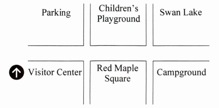 Boys and girls,welcome to the Forest Park. Our first place is the Swan Lake. Here is the route(路线)to the lake. First,turn right at the Visitor Center,then go straight for 15 minutes,turn left at the second crossing and you can see the Swan Lake. It's on the right.