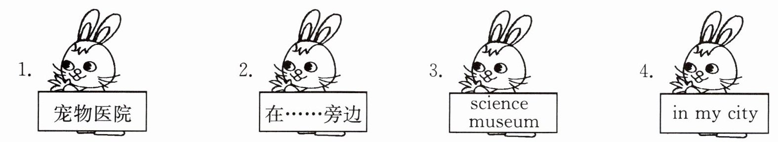 1. pet hospital 2. next to/near 3. 科学博物馆 4. 在我的城市里