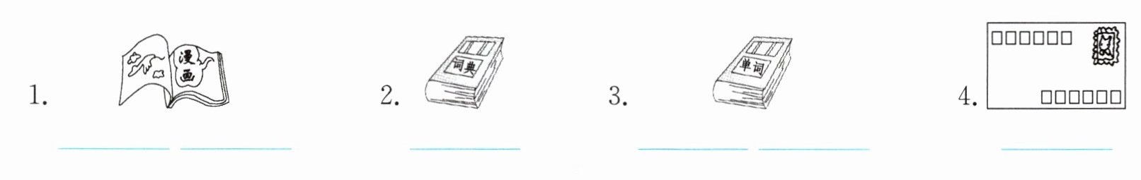 1. comic book 2. dictionary 3. word book 4. postcard
