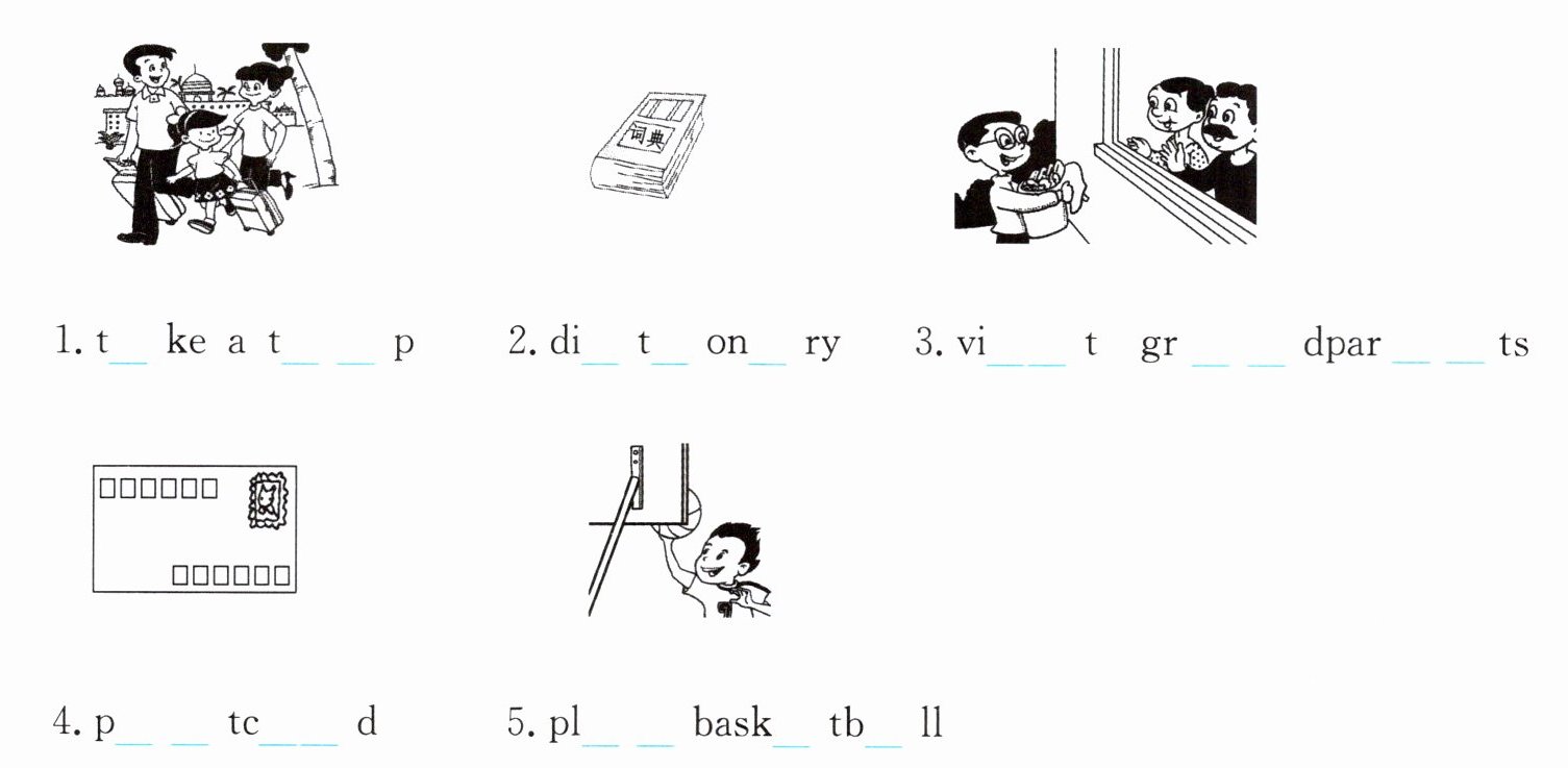 1. take a trip 2. dictionary 3. visit grandparents 4. postcard 5. play basketball