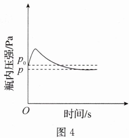 图 3 所示装置中,与集气瓶相连的压强、数据传感器等电子设备能将集气瓶内气体压强精确地记录并保存下来。图 4 为“从点燃酒精灯到熄灭酒精灯”过程中集气瓶内的压强—时间关系图(该装置气密性良好,$p_{0}$ 是集气瓶内初始气压,$p$ 是反应结束后恢复到室温时集气瓶内的气压)。根据实验二的实验结论,可知 $p_{0}$
