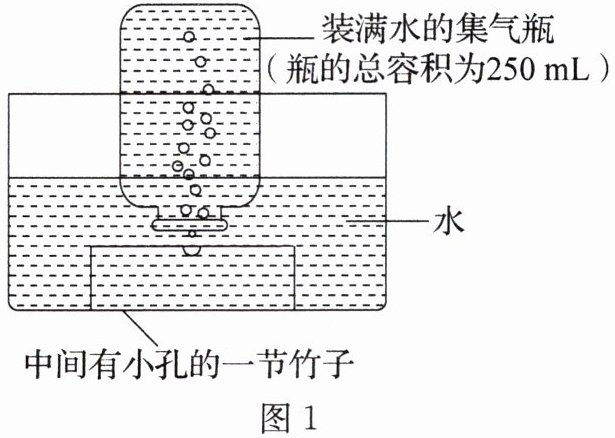 将一节竹子浸没在水中,在竹子上钻孔,用总容积为 $250\ {mL}$ 的集气瓶收集一瓶竹子里的气体,如图 1。