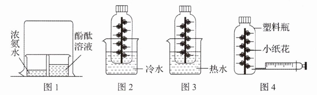 图中无色透明塑料瓶的材质、大小、形状完全相同,瓶内用细线固定用滤纸折叠成的大小和形状完全相同的小纸花,小纸花上都均匀喷有酚酞溶液,按照图 4 的操作方式分别用注射器向图 2 和图 3 的塑料瓶中同时注入 $5$ 滴浓氨水,然后将针孔处密封,再将两个塑料瓶分别同时放入等体积的冷水和 $40 ^{\circ}C$ 的热水中。