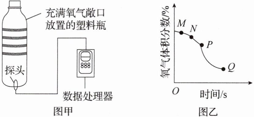 7. 康康同学借助氧气传感器探究微观粒子的运动,用数据处理软件实时绘出氧气体积分数随时间变化的曲线。现收集一塑料瓶氧气进行以下三步实验:①敞口放置;②双手贴在塑料瓶外壁上;③将塑料瓶的瓶口朝下。三步实验中,测得氧气的体积分数随时间变化的曲线依次为图乙中的MN段、NP段和PQ段。