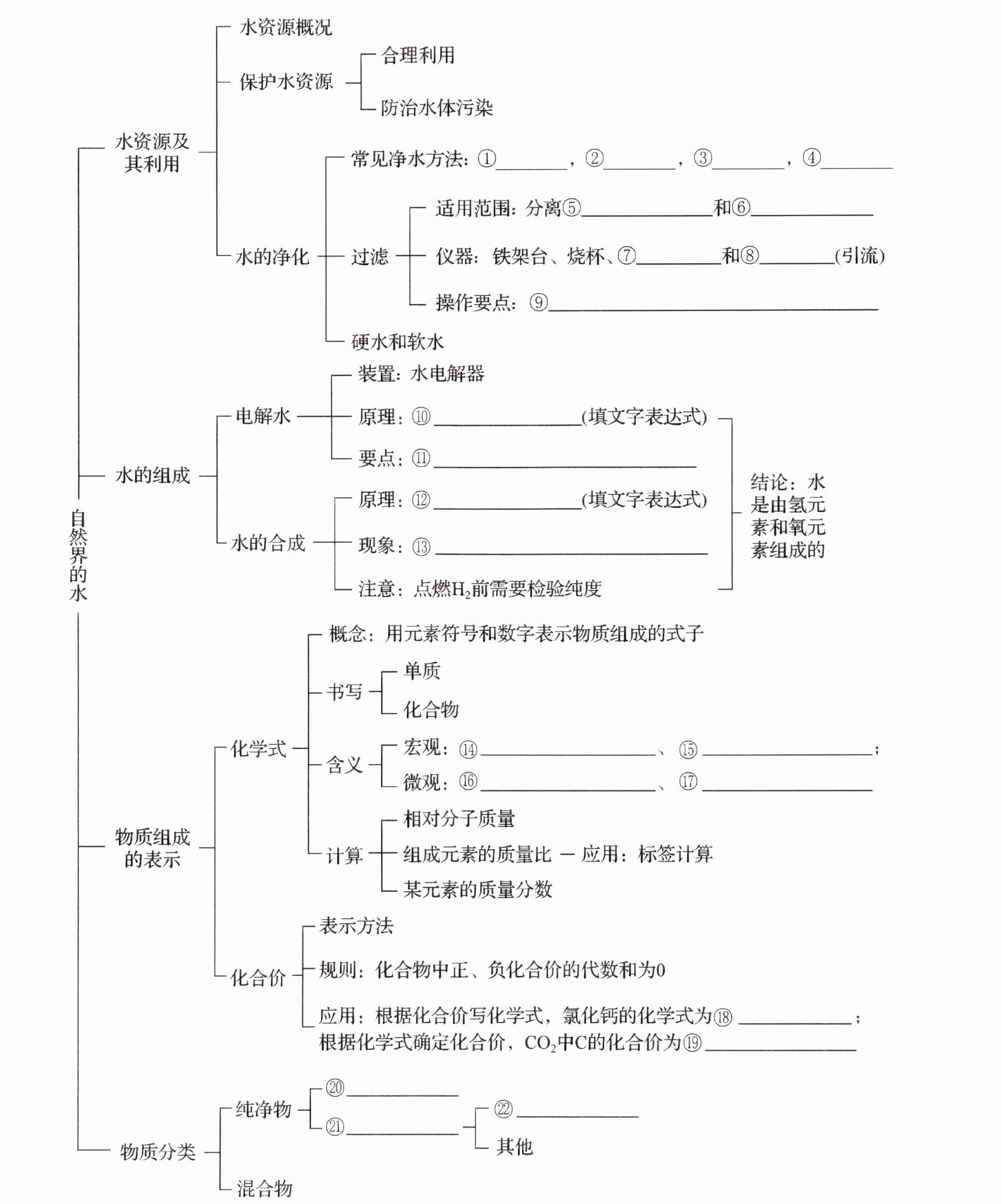 ①沉降 ②过滤 ③吸附 ④蒸馏 ⑤液体 ⑥不溶性固体 ⑦漏斗 ⑧玻璃棒 ⑨一贴二低三靠 ⑩${水\xrightarrow{通电}氢气+氧气}$ ⑪正氧负氢,氢二氧一体积比 ⑫${氢气+氧气\xrightarrow{点燃}水}$ ⑬发出淡蓝色火焰,放热 ⑭表示一种物质 ⑮表示该物质的元素组成 ⑯由分子构成的物质表示一个该物质的分子 ⑰由分子构成的物质表示分子的构成情况 ⑱${CaCl_{2}}$ ⑲$+4$ ⑳单质 ㉑化合物 ㉒氧化物