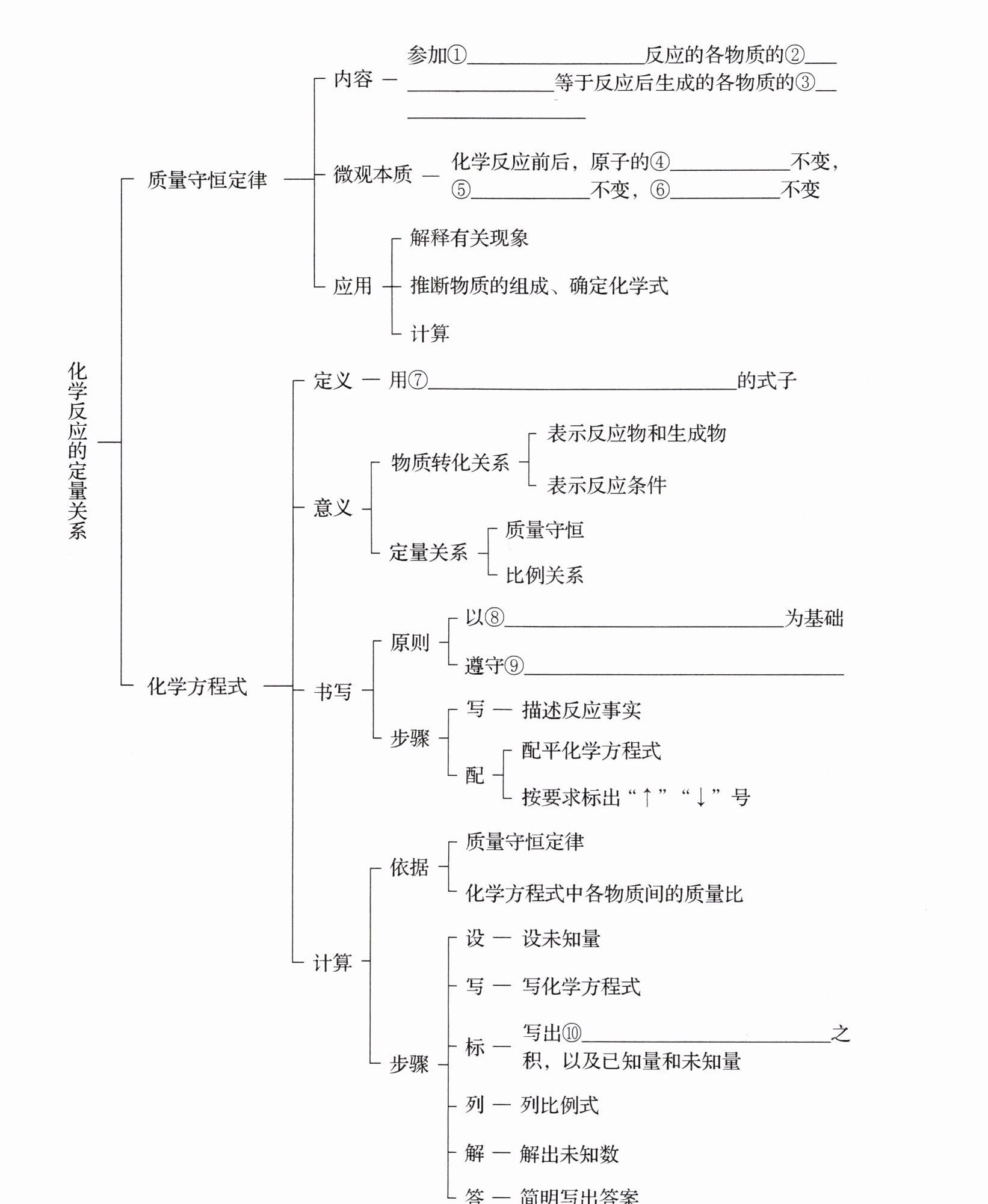 ①化学 ②质量总和 ③质量总和 ④种类 ⑤数目 ⑥质量 ⑦化学式来表示化学反应 ⑧客观事实 ⑨质量守恒定律 ⑩相关物质的化学计量数与相对分子质量