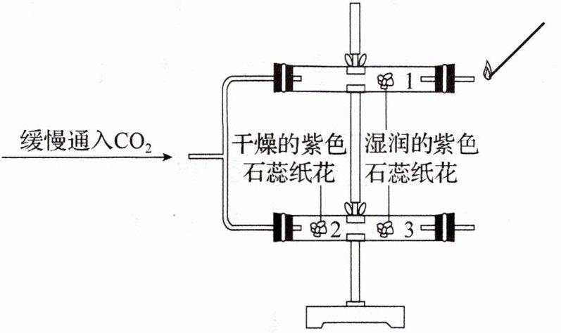 (1)干燥的紫色石蕊纸花(2处)不变色,湿润的紫色石蕊纸花(1和3处)由紫色变成红色 3处湿润的紫色石蕊纸花先变成红色 (2)不燃烧、不支持燃烧
