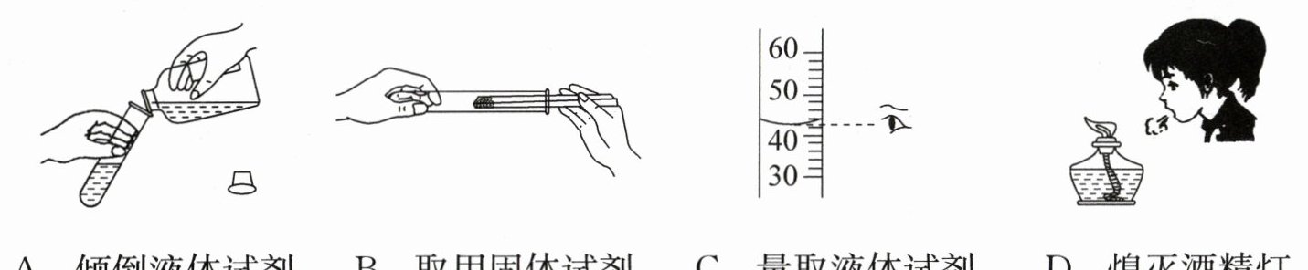 D 解析:倾倒液体试剂时,为防止污染试剂,瓶塞要倒放在实验台上;试管口需紧挨瓶口;细口瓶标签朝向手心,故A操作正确。取用固体试剂时应先使用药匙或纸槽将试剂送入试管底部,然后缓缓将试管竖立起来,故B操作正确。量取液体试剂时,视线应与凹液面最低处保持水平,故C操作正确。熄灭酒精灯应用灯帽盖灭,故D操作错误。