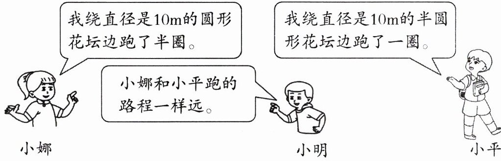 小平绕直径是$10m$的半圆形花坛边跑了一圈,半圆的周长是圆周长的一半加上直径,即$\frac{1}{2}×\pi×10 + 10 = 5\pi + 10\approx5×3.14 + 10 = 15.7 + 10 = 25.7$($m$)。