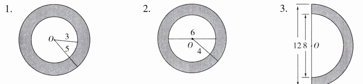 1. $3.14×(5^2 - 3^2) = 3.14×(25 - 9) = 3.14×16 = 50.24\,\text{cm}^2$