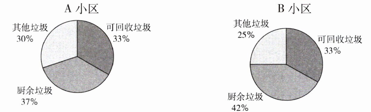 选项A:A小区可回收垃圾占比$33\%$,B小区可回收垃圾占比也$33\%$,但不知道两个小区垃圾回收的总量,所以不能确定两个小区的可回收垃圾量一样多,该选项错误。