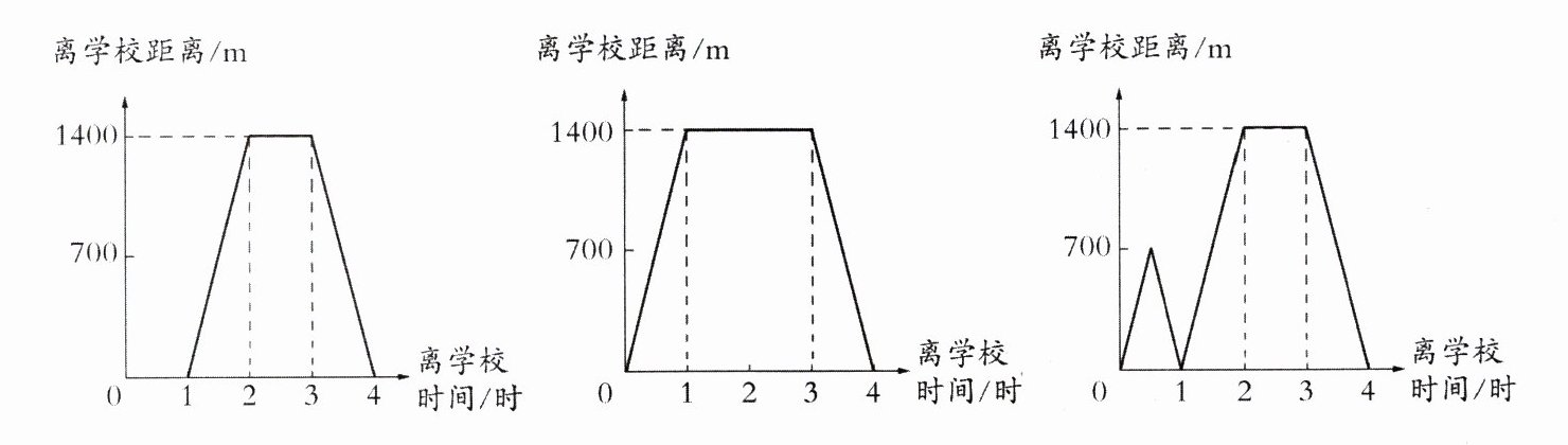 第三幅图,0到0.5时,离学校距离从700逐渐减小到0,0.5到1.5时,离学校距离从0逐渐增大到700,1.5到2时,离学校距离从700逐渐增大到1400,2到3时,离学校距离保持1400米不变,3到4时,离学校距离从1400逐渐减小到0,符合小明的情况。