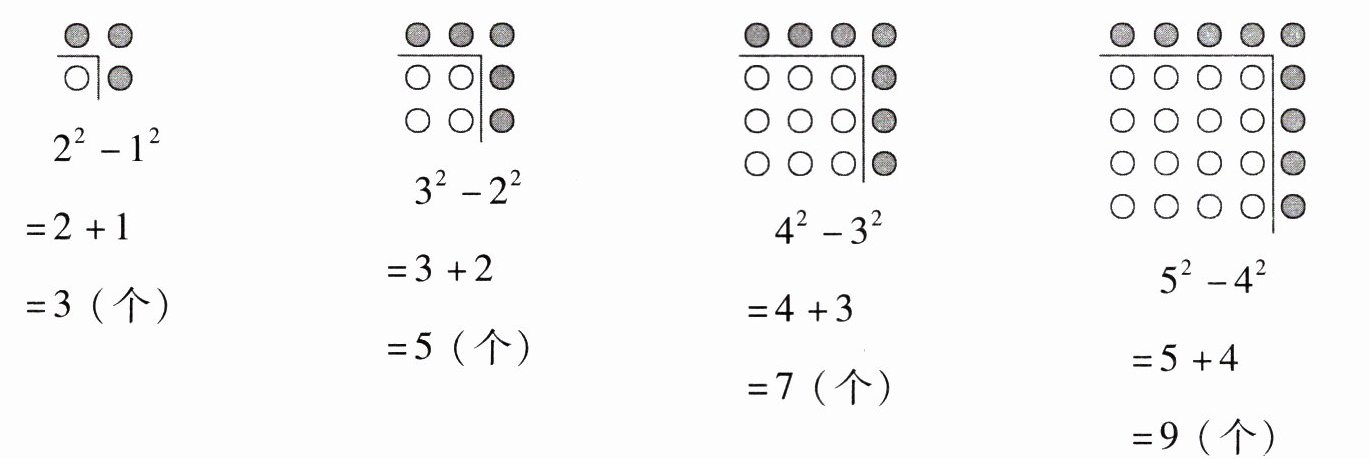 $2^{2}-1^{2}=2 + 1=3$(个),对应图形中$●$有$3$个;