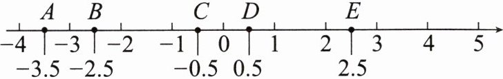点A表示的数:-3.5;点B表示的数:-2.5;点C表示的数:-0.5;点D表示的数:0.5;点E表示的数:2.5。