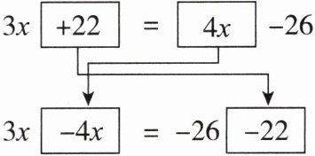 问题 3:把得到的方程 $3x - 4x = -26 - 22$ 与原方程 $3x + 22 = 4x - 26$ 比较,这个变形相当于把原方程左边的 22 变为