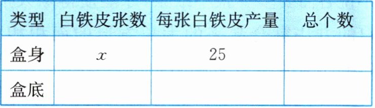 【例1】用白铁皮做罐头盒,每张白铁皮可制作盒身$25个或盒底40$个,$1个盒身与2个盒底配成1$个罐头盒。现有$36$张白铁皮,用多少张制作盒身,多少张制作盒底可以使盒身与盒底正好配套?