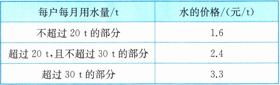 (2)解:因为20×1.6+10×2.4=56<62.6,所以小红家6月份的用水量超过30 t.设小红家6月份的用水量为x t.根据题意,得20×1.6+10×2.4+(x-30)×3.3=62.6.解得x=32.答:小红家6月份的用水量为32 t.