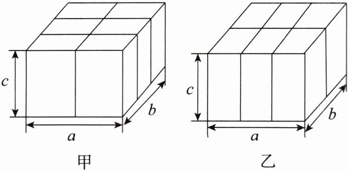 包装物品用到的箱子的长、宽、高分别为 $ a cm $,$ b cm $,$ c cm $,如图所示,小明和小华在打包时,分别采用了甲、乙两种打包方式(单位:$ cm $,打包带不计接头处的长)。