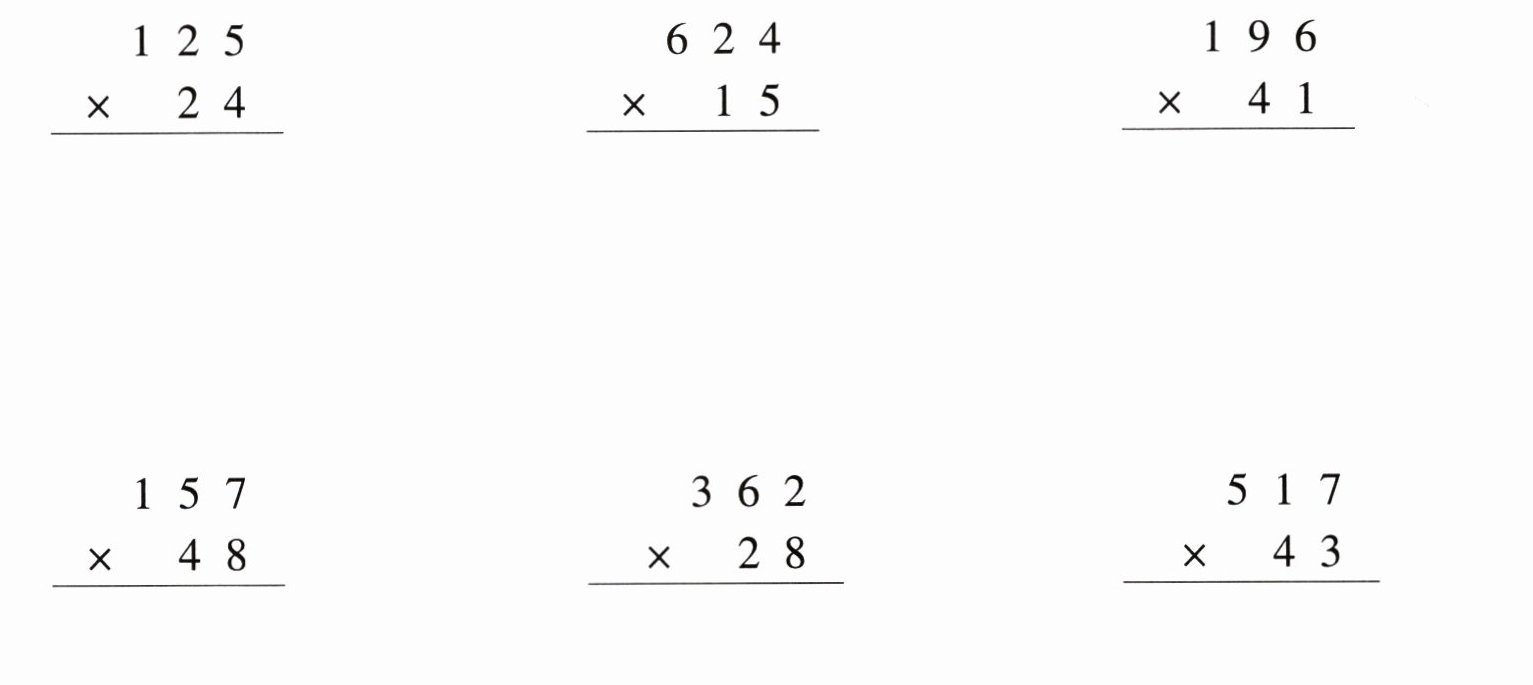 $\begin{array}{r r r}&&&&1&2&5 \\ ×&&&&&2&4 \\ \hline &&&&5&0&0\\&&&2&5&0& \\ \hline &&&3&0&0&0\end{array}$