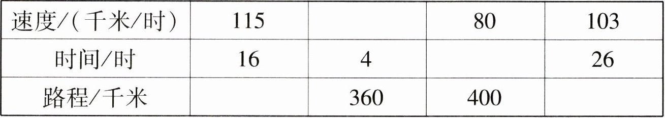 第一列:已知速度为$115$千米/时,时间为$16$小时,根据上述公式可得路程为$115×16 = 1840$(千米)。