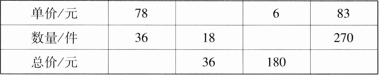 | 单价/元 | 78 | 2 | 6 | 83 |