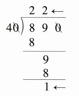 1. 用890元购买40元一个的篮球,最多可以买几个?还剩几元?用竖式计算如下所示,竖式中箭头所指的部分表示(