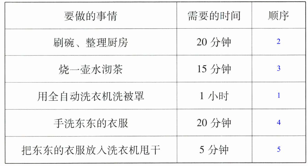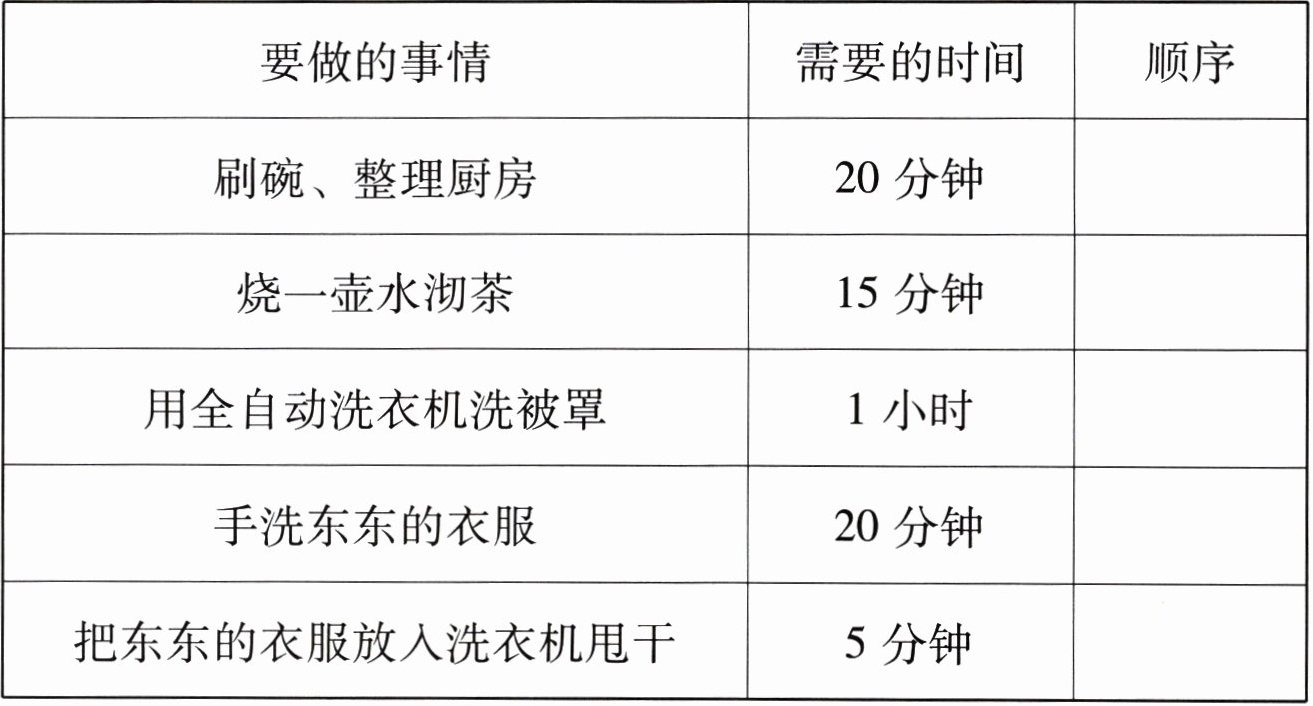 2. 星期六吃过早饭,东东的妈妈要做下面这些事,请你帮她安排做事的顺序。