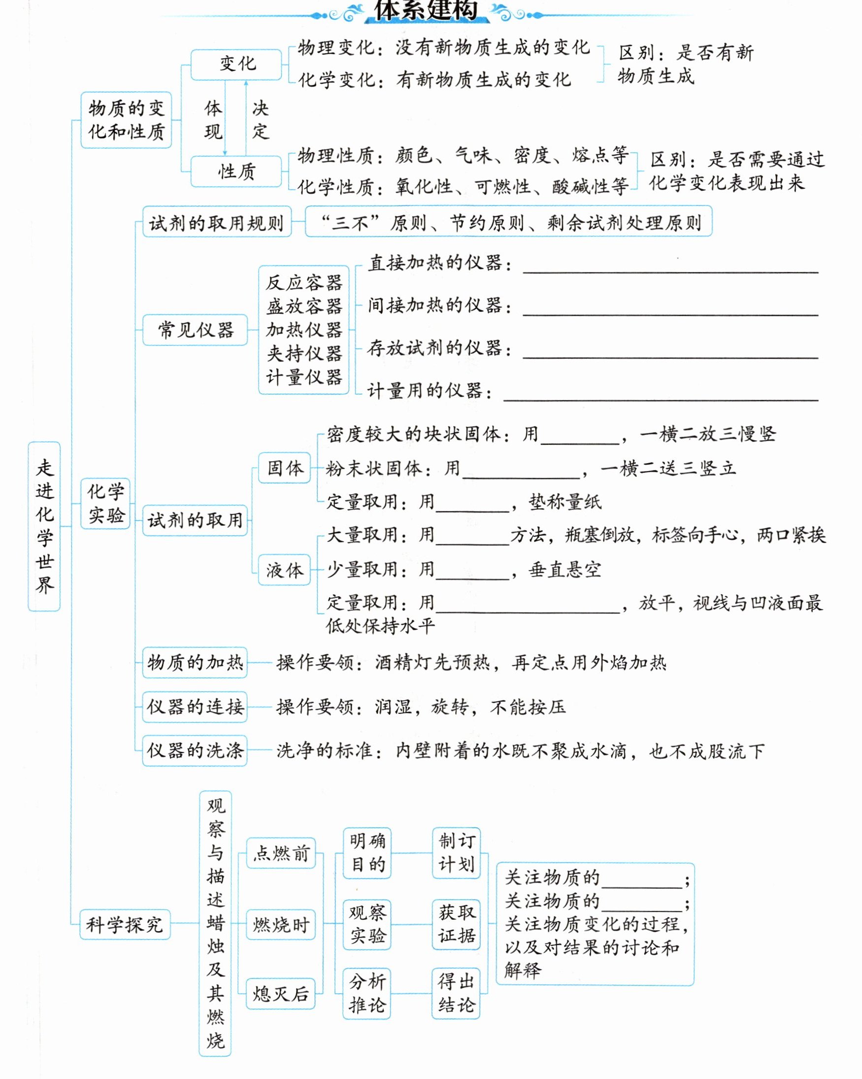 试管、燃烧匙、蒸发皿 烧杯、锥形瓶 广口瓶、细口瓶、集气瓶 托盘天平、量筒 镊子 药匙(或纸槽) 托盘天平 倾倒 胶头滴管 量筒和胶头滴管 性质 变化