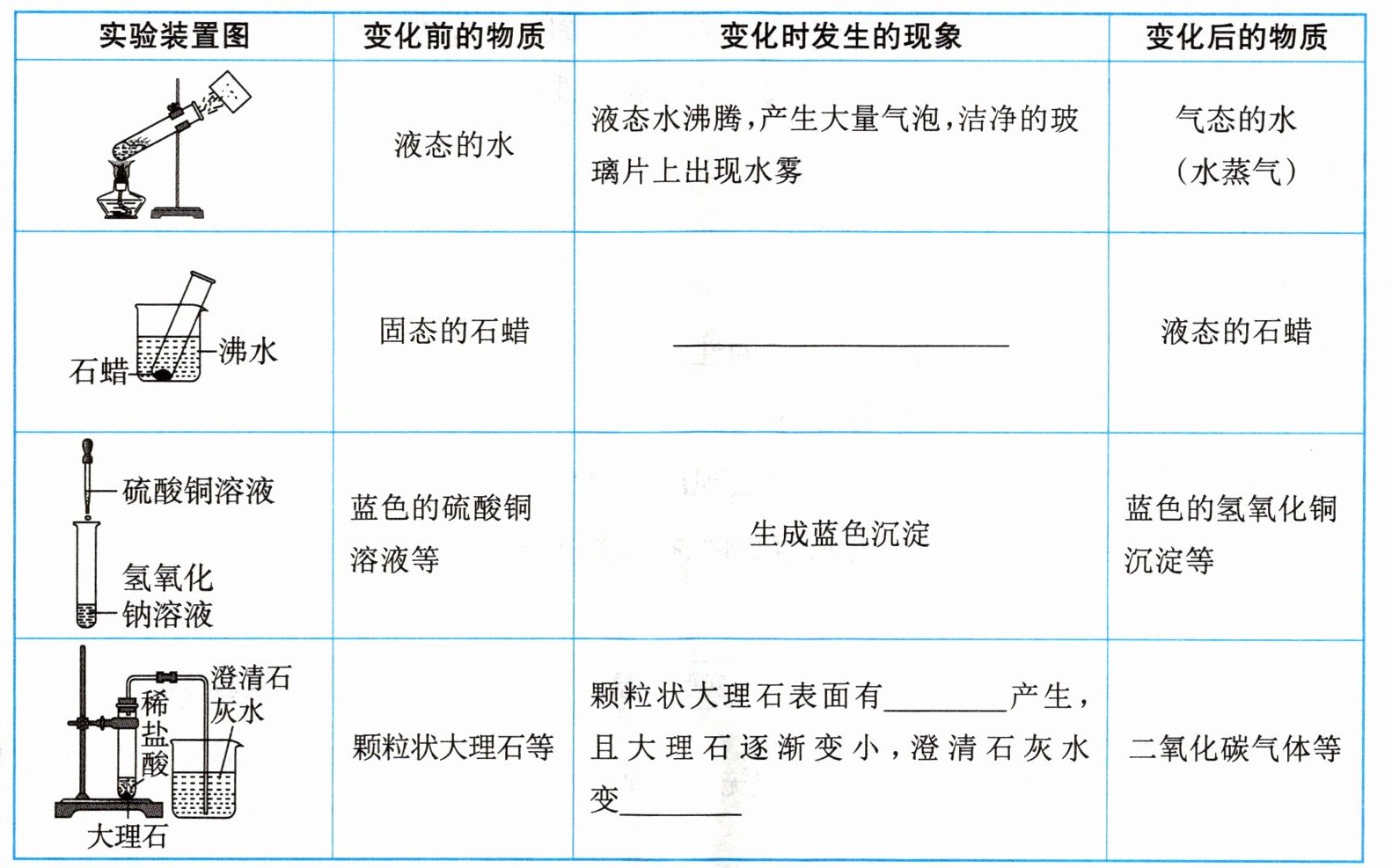 [点拨]①水的沸腾、石蜡熔化只是物质的状态、形状发生了变化,并没有生成新物质。