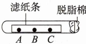 4. 如图所示,某同学用酚酞溶液和浓氨水做“氨分子的扩散”实验,在滤纸条上滴上酚酞溶液,然后在脱脂棉上滴加浓氨水,应该观察到的现象是____,结果发现试管内滤纸条上没有变色,而试管口所塞的脱脂棉却变成红色,导致这种现象产生的错误操作可能是____,这一实验说明,所用的两种试剂中____具有挥发性。