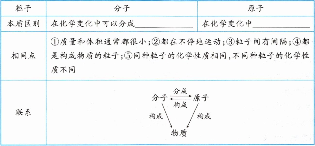 |相同点|①质量和体积通常都很小;②都在不停地运动;③粒子间有间隔;④都是构成物质的粒子;⑤同种粒子的化学性质相同,不同种粒子的化学性质不同|