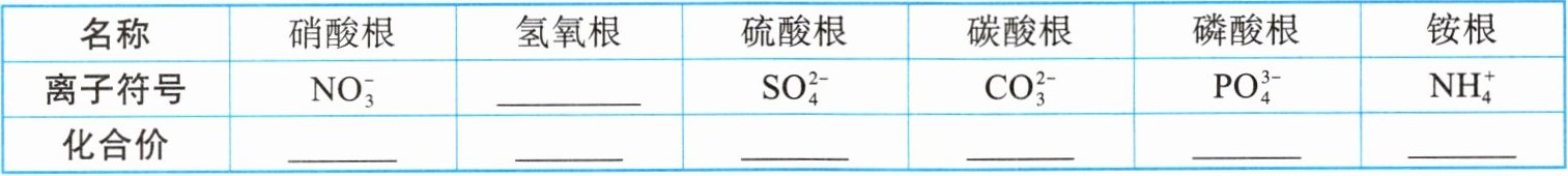 |名称|硝酸根|氢氧根|硫酸根|碳酸根|磷酸根|铵根|