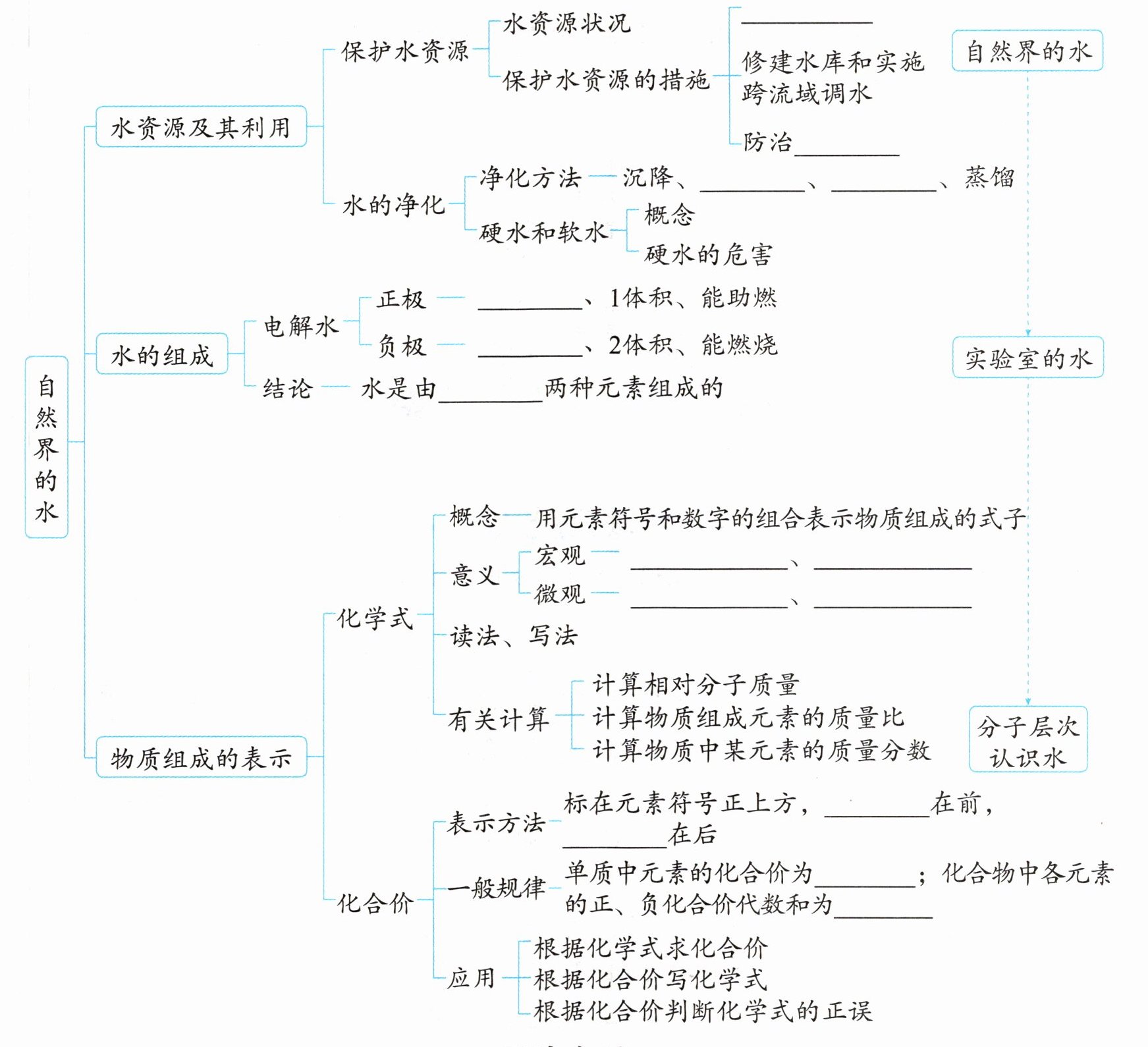 节约用水 水体污染 过滤 吸附 氧气 氢气 氢、氧 表示一种物质 表示物质的元素组成 表示物质的一个分子 表示物质的分子构成 正、负号 数字 0 0