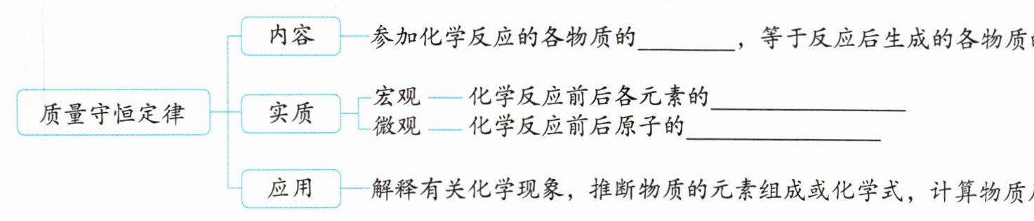 - 内容:参加化学反应的各物质的____,等于反应后生成的各物质的____