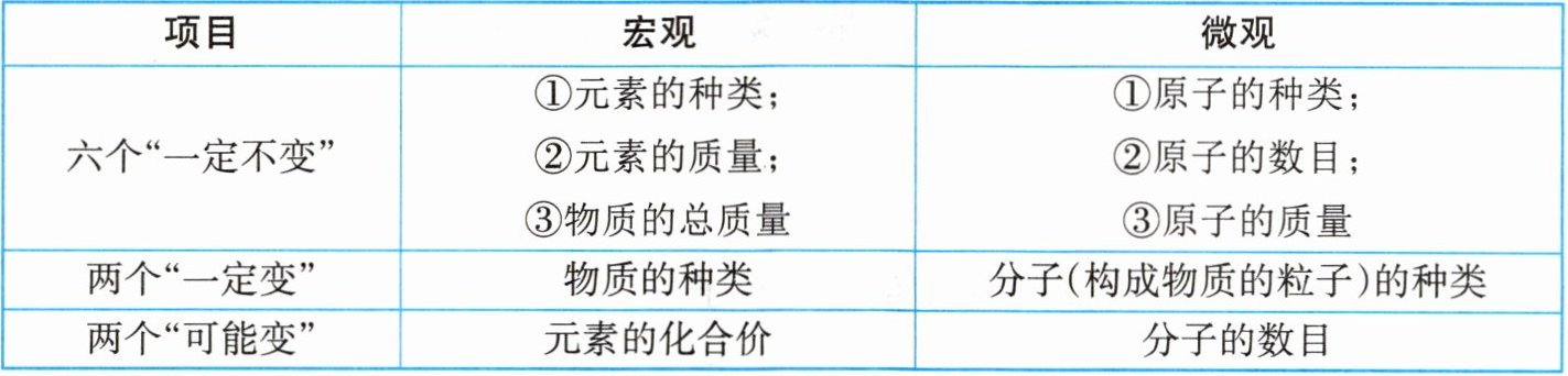 |六个“一定不变”|①元素的种类;②元素的质量;③物质的总质量|①原子的种类;②原子的数目;③原子的质量|