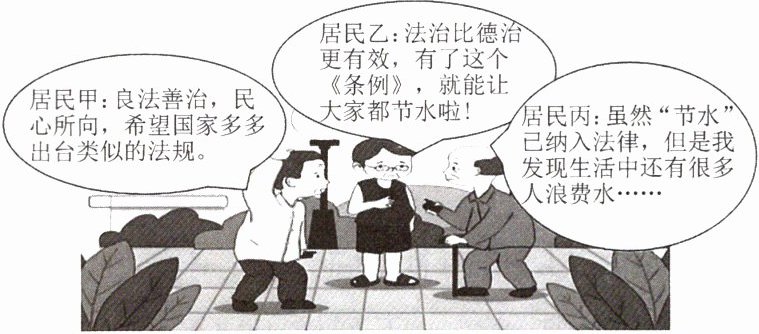 材料二 国家层面首次“节水”立法:《节约用水条例》(以下简称《条例》)自2024年5月1日起施行。《条例》针对节水工作中存在的突出问题和薄弱环节,对用水、节水和管理的各个方面和各个环节都作出明确具体的规定,完善了节水制度。某社区居民就此发表了各自的观点。