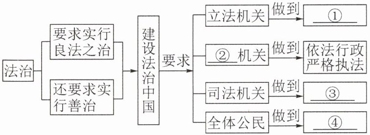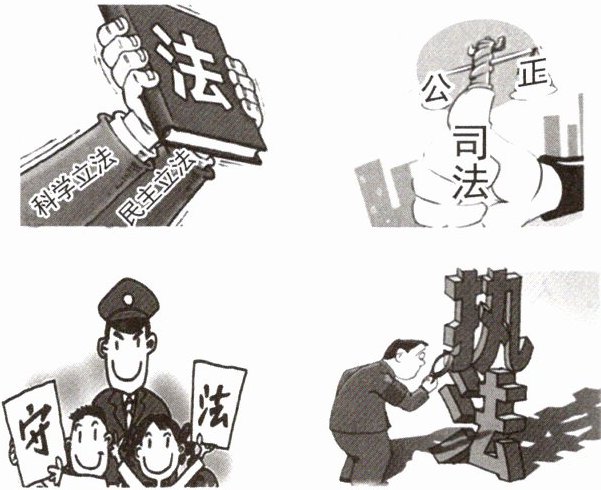 (1)①科学立法。②行政。③公正司法。④全民守法。