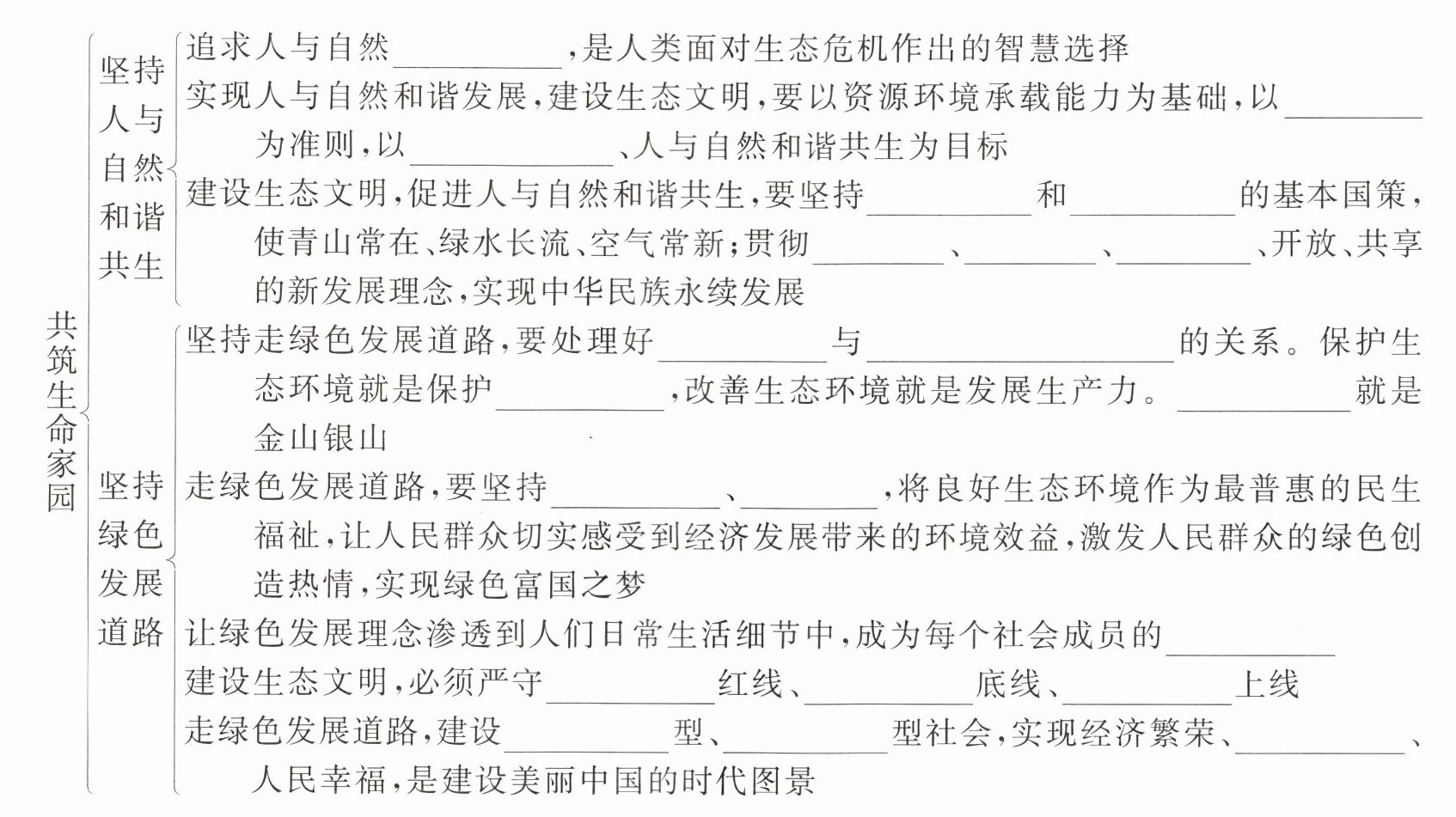 共筑生命家园坚持人与自然和谐共生追求人与自然______,是人类面对生态危机作出的智慧选择实现人与自然和谐发展,建设生态文明,要以资源环境承载能力为基础,以______为准则,以______、人与自然和谐共生为目标建设生态文明,促进人与自然和谐共生,要坚持______和______的基本国策,使青山常在、绿水长流、空气常新;贯彻______、______、______、开放、共享的新发展理念,实现中华民族永续发展坚持绿色发展道路坚持走绿色发展道路,要处理好______与______的关系。保护生态环境就是保护______,改善生态环境就是发展生产力。______就是金山银山坚持走绿色发展道路,要坚持______、______,将良好生态环境作为最普惠的民生福祉,让人民群众切实感受到经济发展带来的环境效益,激发人民群众的绿色创造热情,实现绿色富国之梦让绿色发展理念渗透到人们日常生活细节中,成为每个社会成员的______建设生态文明,必须严守______红线、______底线、______上线走绿色发展道路,建设______型、______型社会,实现经济繁荣、______、人民幸福,是建设美丽中国的时代图景